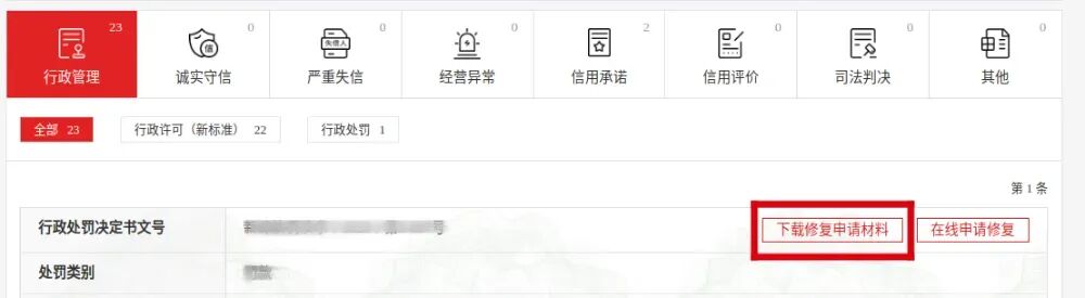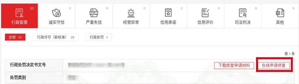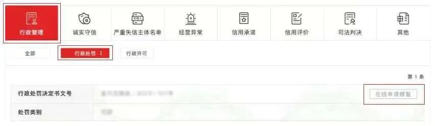 3. 找到“行政管理”栏目,点下面的“行政处罚”,就能看到相关的处罚记录;4. 看处罚信息右上角的“在线申请修复”按钮:红色就能申请,灰色就是还没到能申请的最短公示期,得再等等。