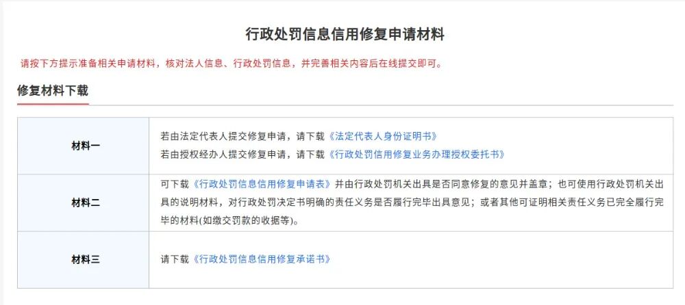 - 要是老板(法定代表人)自己办,下载《法定代表人身份证明书》;- 要是委托别人办,下载《行政处罚信用修复业务办理授权委托书》;- 必须准备:能证明罚款交完、责任都履行好的材料(比如交罚款的收据),或者填好《行政处罚信息信用修复申请表》让处罚机关盖章同意;- 还要下载《行政处罚信息信用修复承诺书》,按要求填好。