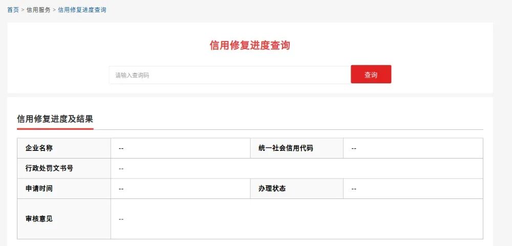 1. 打开“信用中国”网站,点右上角的“信用修复”;2. 点左上角“修复进度自助查询”下面的“行政处罚信息信用修复”;