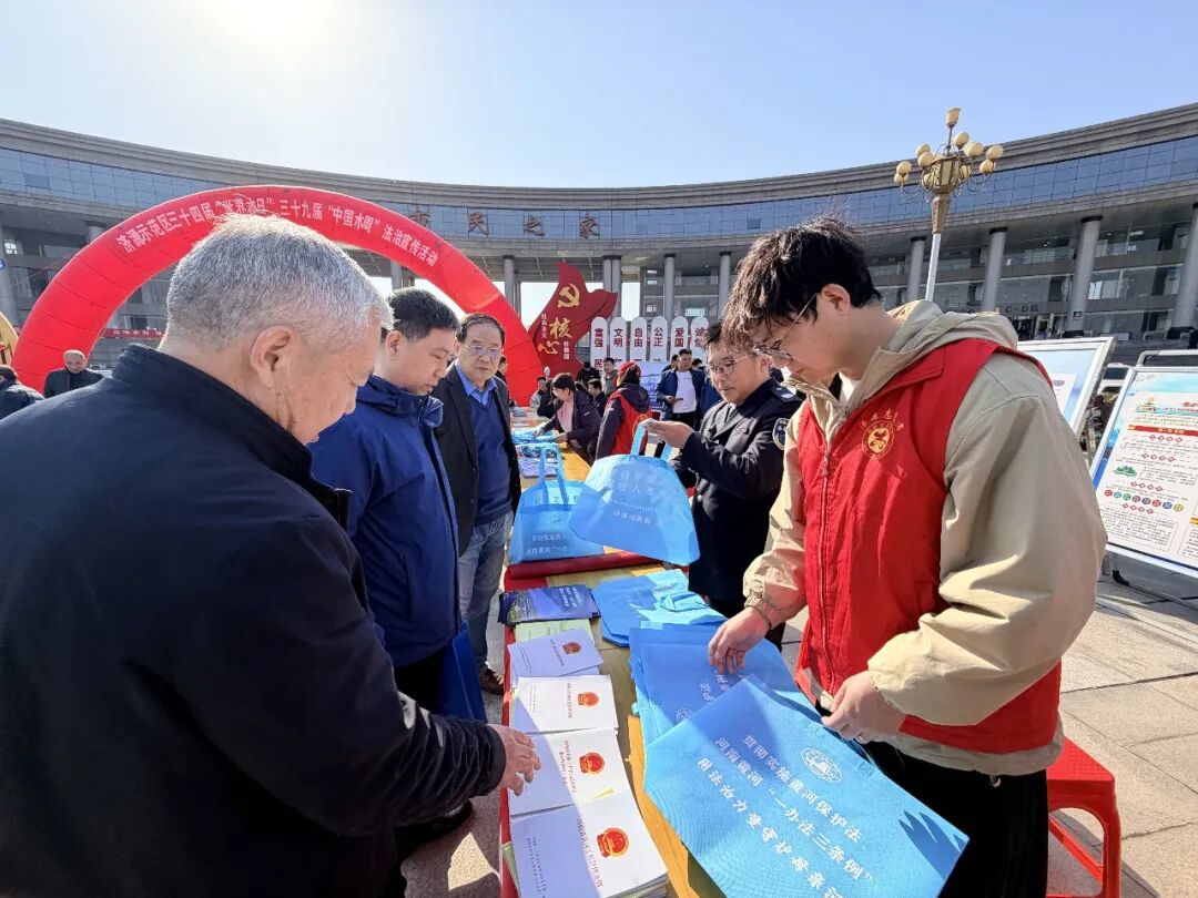 近日,示范区水利局组织协调机关事务中心、济源黄河河务局、水文水资源测报济源分中心、河口村水库运行中心、焦作市引沁广利灌区服务中心、黄河小浪底库区水文勘测局等多家单位,在第二行政区一号楼前搭建宣传阵地,布设专题展板,设立水法律法规咨询台与政策宣讲台,通过图文展示、现场讲解等形式,集中展示水行政执法、普法宣传、节约用水、水资源管理、河湖保护等重点工作成效。宣传过程中,工作人员聚焦新颁布、新修订的《供水条例》《节约用水条例》《河南省实施〈中华人民共和国黄河保护法〉办法》《中华人民共和国水土保持法》等核心法律法规,结合济源市情水情,重点围绕国家节水行动、水生态修复、水土保持、城乡居民用水安全等群众广泛关注的内容展开宣讲。针对群众提出的河道管理、用水规范、节水技巧等问题,咨询台工作人员耐心细致解答,切实推动水法治知识深入人心,引导群众树立依法节水、依法护水、依法治水的意识。参加活动人员及过往群众积极在“世界水日 中国水周”宣传条幅上签名承诺,纷纷表示将自觉践行节水责任,争当节约用水的宣传者、文明用水的倡导者、科学用水的践行者。